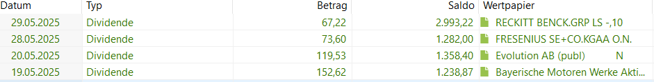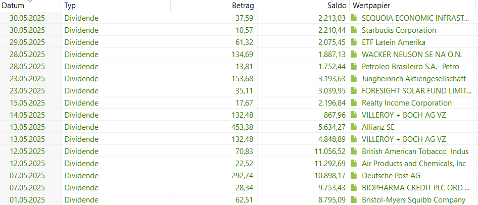 Im Mai 2025 flossen 2.635 € an Dividenden in das Depot. Dies ist eine Steigerung gegenüber dem Mai 2024 von 10,3%.