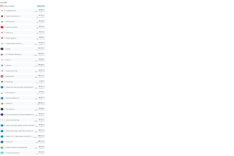 Insgesamt erhielt ich im Mai 2025 2.305,70 € Bruttodidende. Diese ergaben sich aus insgesamt 28 Zahlungen. Das entspricht einer Steigerung von 10,7% zum Vorjahr.